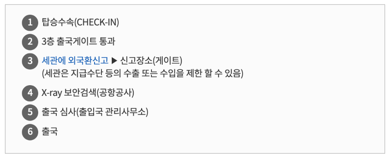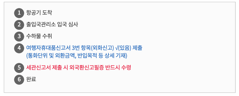 체재기간과 여행목적국, 동행인 유무 여부등을 확인한 세관직원이 교부하는 여행경비 확인서를 작성하셔서 제출하시면 완료 됩니다.