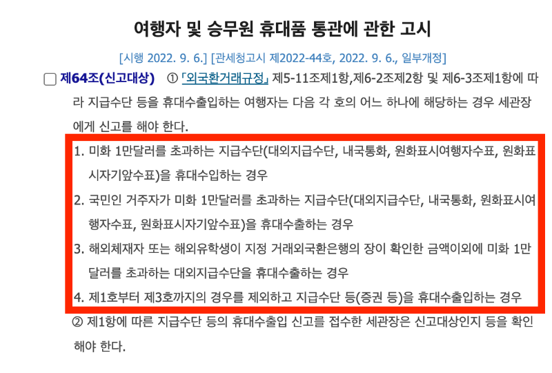 - 여행자 및 승무원 휴대품 통관에 관한 고시 제 64조