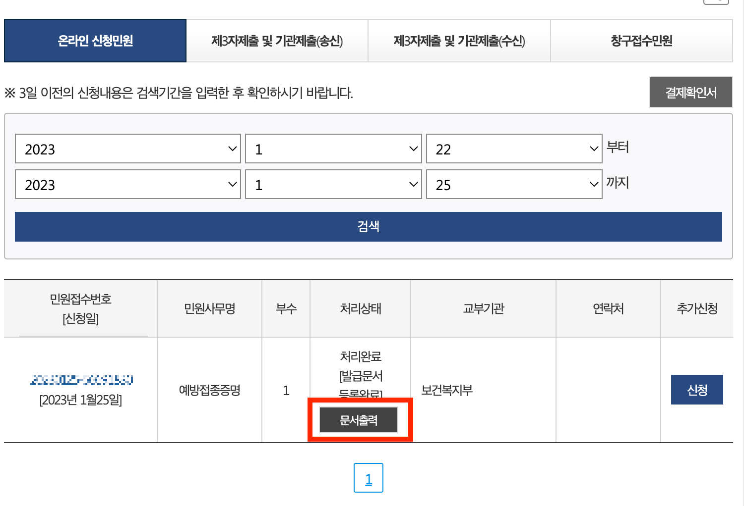 온라인발급(본인출력) 선택 후 '민원신청하기' 를 누르세요.