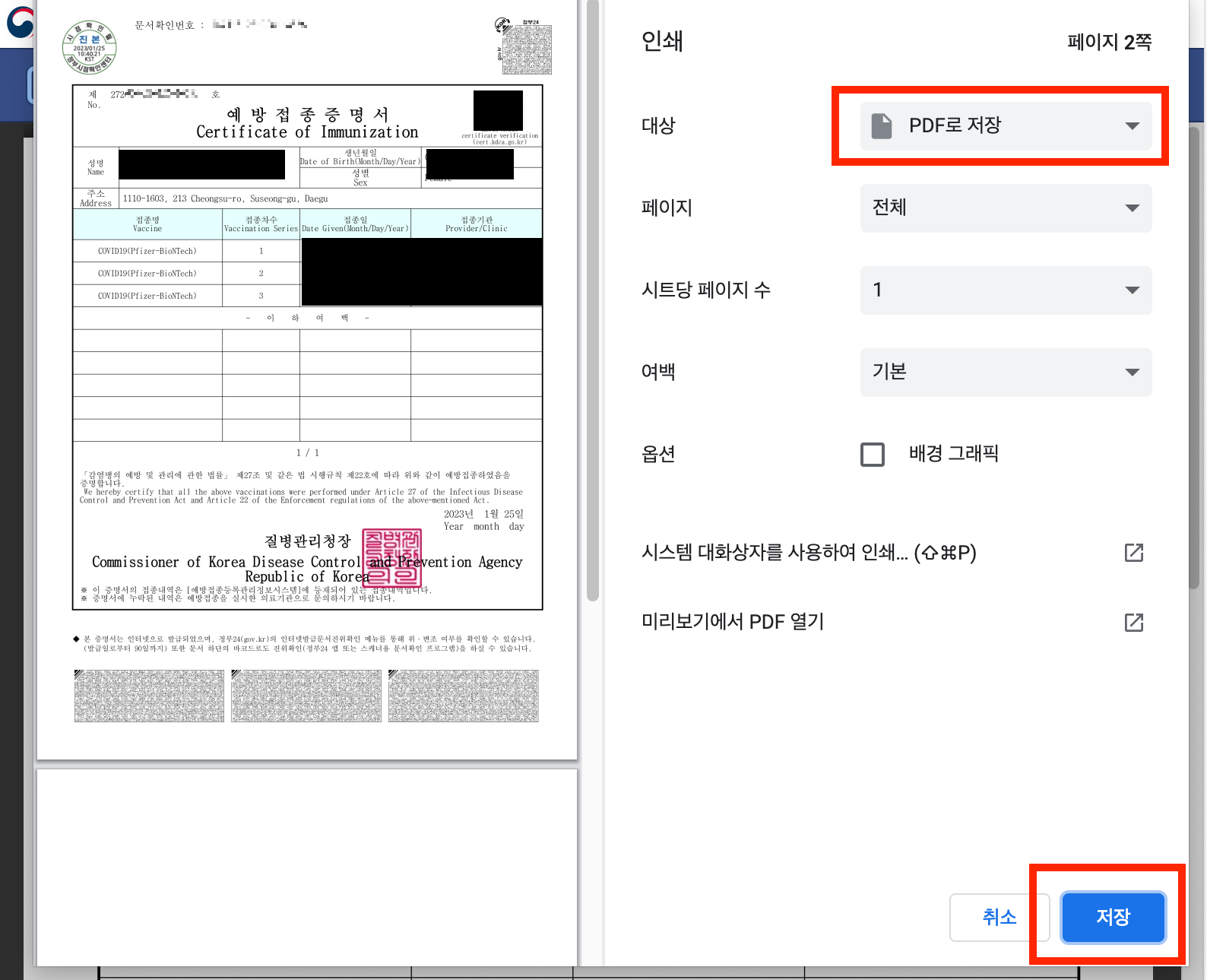 예방접종증명서는 정부24에서 발급 받으실 수 있습니다. 구글에서 정부 24 예방접종증명 검색 하시면 바로 사이트 접속이 가능 합니다.  네이버 문서 등으로 발급 받은 예방접종증명서는 파일화가 불가능합니다.  질병관리청 혹은 정부 24를 통해 증명서를 발급 받으시길 바랍니다.