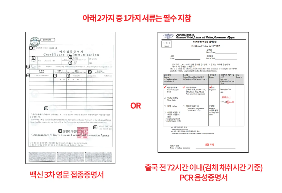 2차 이내 접종자 및 미접종자출국 전 72시간 검체(채취시간 기준)PCR 음성 증명서 를 필수로 제시 하여야 합니다.