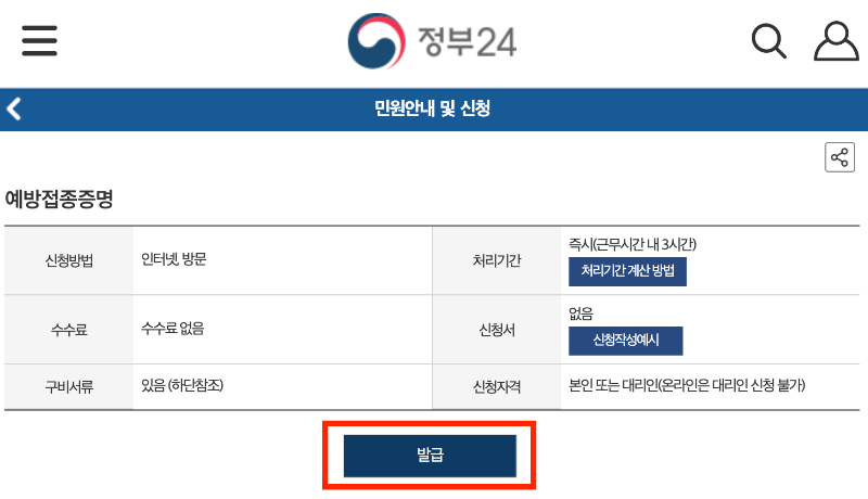 페이지에서 발급을 클릭 하시면 코로나 19 예방접종증명서를 발급 받으실 수 있습니다. '영문' 으로 발급 받으세요.