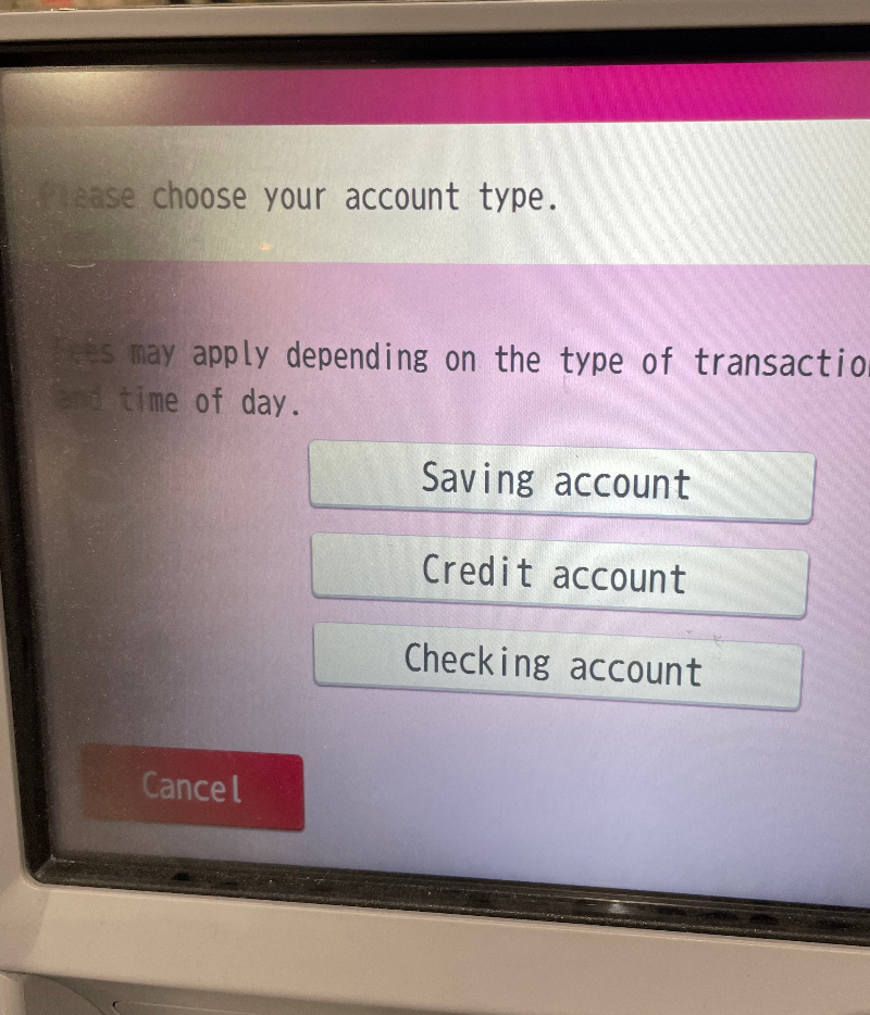 실물카드를 넣었을 때 카드 종류를 International Card 로 선택 하셔야 인출 페이지로 넘어갑니다. 계좌 타입은 보통 Checking account를 선택해서 인출합니다.