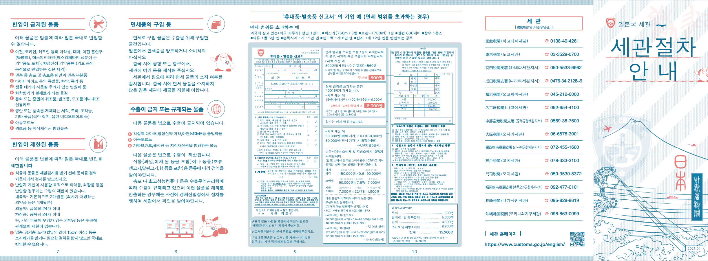 세관에서는 해외에서 입국(귀국) 하는 모든 사람에게 반입이 금지되거나 제한된 물품의 유무와 면세 범위를 초과한 물품의 유무 등을 확인하고 있습니다. 현재 일본에서는 Visit Japan Web 을 통해 비교적 간단하게 세관신고를 할 수 있습니다.