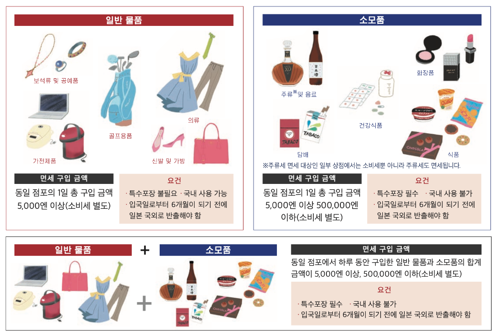 식품, 화장품, 의약품 등의 소모품은 같은 점포에서 1일 총 구매 금액이 5,000~500,000엔 이내여야 하며, 일본 내에서 소비되지 않도록 지정된 방식으로 포장되어야 합니다.