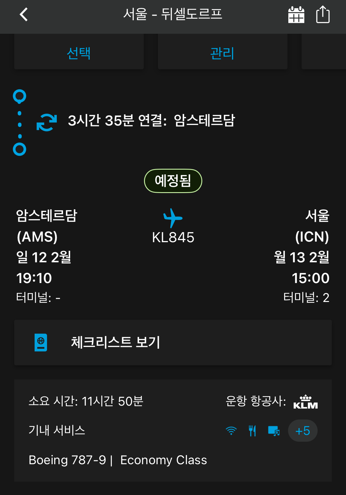 암스테르담 스키폴 공항에서 인천까지는 11시간 50분이 소요 되었습니다.